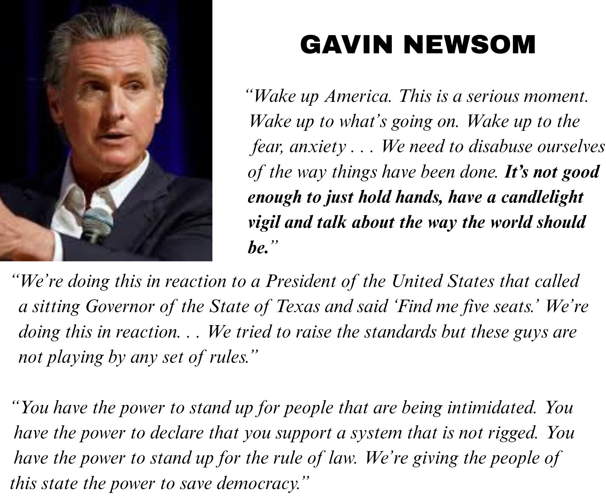 And across the country on the west coast, we have California Governor Gavin Newsom and some key quotes from his speech announcing his state’s plan to respond aggressively to the Texas mid-decade extreme gerrymandering effort to protect the narrow GOP House majority.