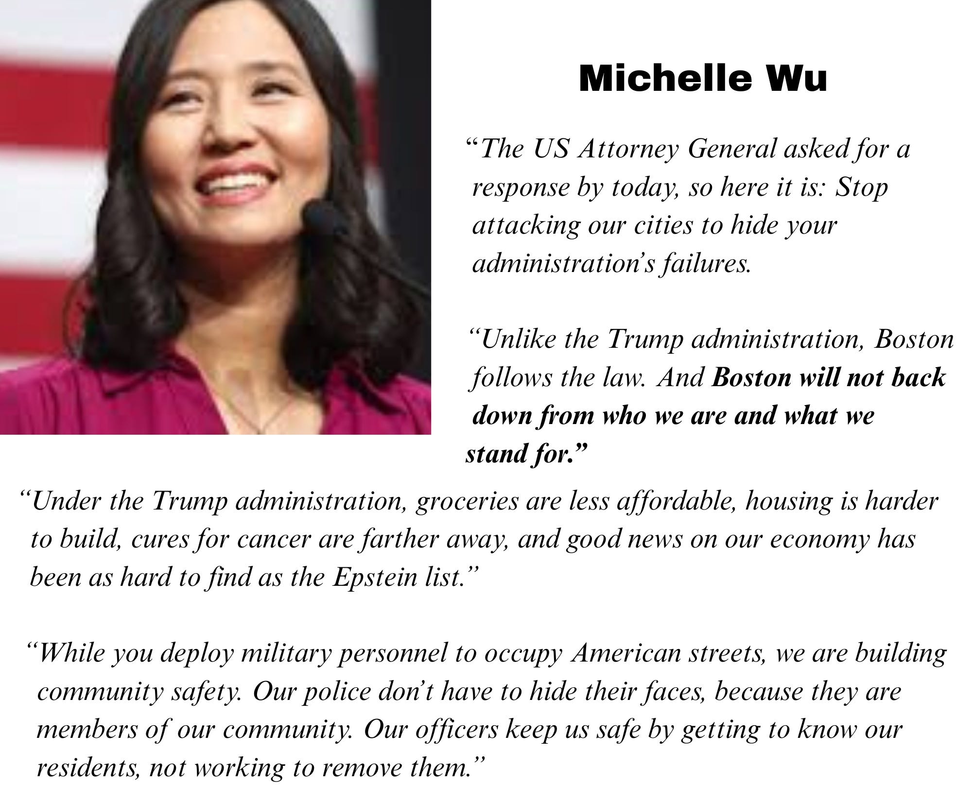Here are two strong examples from the past week from opposite ends of the country. First some key quotes from Boston Mayor Michelle Wu responding to a threatening letter from Attorney General Pam Bondi demanding more cooperation with the federal government’s harsh immigration policies.